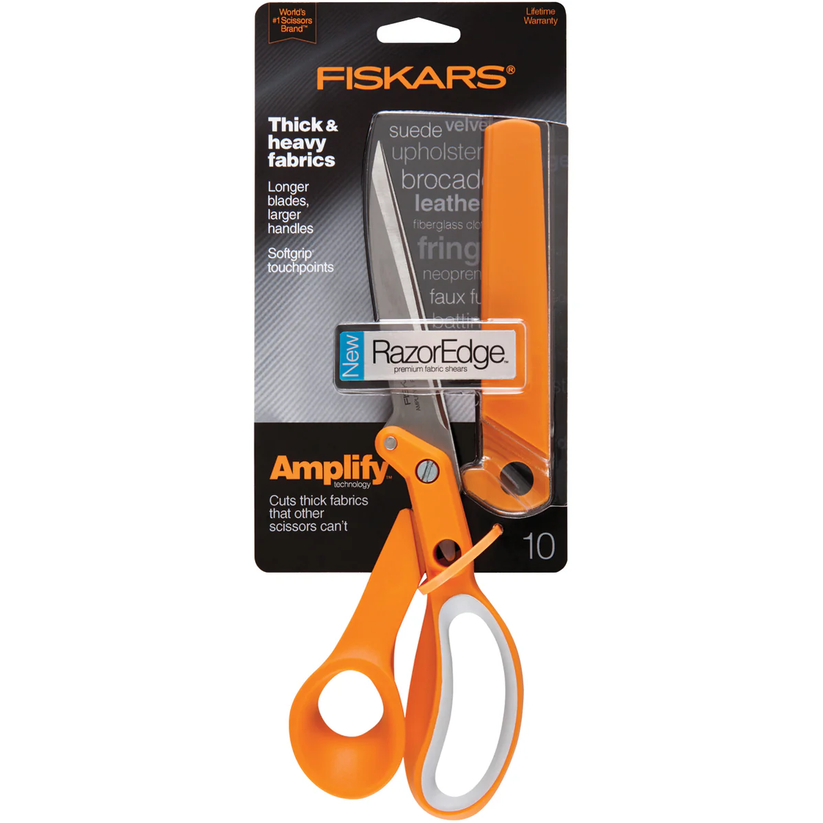 Amplify® RazorEdge 10″ Fabric Scissors are designed to cut thick and heavy fabrics, these premium fabric shears feature a larger handle and longer, ultra-sharp blades ideal for cutting long swathes. Perfect for users with larger hands or anyone who needs to make long cuts through multiple layers, our Amplify‚® RazorEdge Fabric Shears sense blade separation and force the blades back together to cut cleanly through heavy materials.